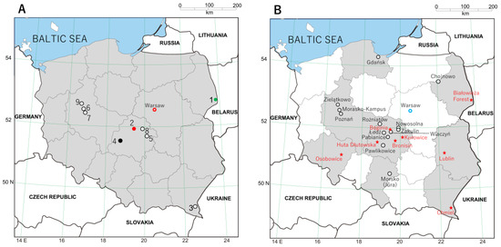 Shrews and moles, captured during 1990–2017 in nine sites across Poland (Figure 1A) as previously described [22,23], were euthanized by means of cervical dislocation. Carcasses were then stored at –20 °C for months to years before lung tissues were dissected and preserved in RNAlater® RNA Stabilization Reagent (Qiagen, Valencia, CA, USA). In earlier studies, shrews and moles were collected in Boginia, Chmiel, Huta Dłutowska and Kurowice [22,23]. However, the Global Positioning System coordinates of the trap sites in these sites were different in the present study: Boginia (51°50′18.05″ N, 19°36′41.85″ E), Huta Dłutowska (51°35′41.69″ N, 19°23′2.63″ E) and Kurowice (51°39′57.90″ N, 19°42′8.95″ E) in Łódź province; Chmiel (49°13′14.80″ N, 22°36′8.12″ E) in Subcarpathia province. Newly sampled sites included Białowieża Forest (52°43′6.02″ N, 23°51′0.21″ E) in Podlasie province; Poznań, Morasko-Kampus (52°28′1.67″ N, 16°55′22.51″ E), Poznań, city center (52°24′22.55″ N, 16°56′4.44″ E) and Zielątkowo (52°33′29.13″ N, 16°47′33.82″ E) in Greater Poland province; Zakulin (51°59′31.48″ N, 19°56′19.53″ E) in Łódź province. In addition, lung tissues from European moles captured in Lviv (49°50’16.93″ N, 24°0’29.64″ E) in Ukraine in 2016 were analyzed (Table 1).