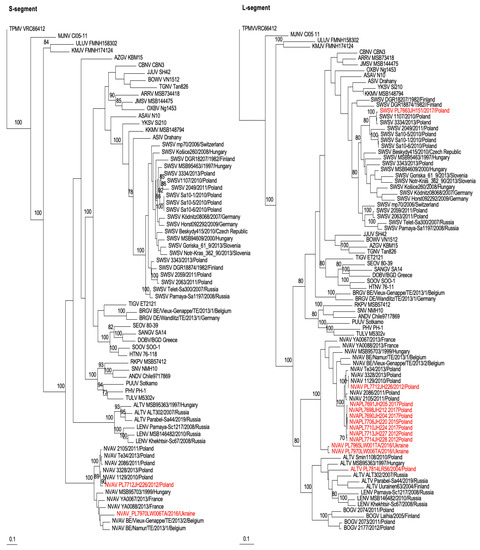Phylogenetic trees generated by way of the maximum-likelihood method using PAUP* and based on the 698- and 707-nucleotide S-segment and the partial 353-nucleotide L-segment sequences of NVAV from European moles captured in Poland, Ukraine, Belgium, France and Hungary, showing geographic-specific clustering. Similarly, SWSV strains from Poland and elsewhere are grouped according to geography. Newfound sequences from Poland and Ukraine are shown in red lettering. SWSV, ALTV and NVAV strains show the year of capture of the host and the country of origin. GenBank numbers for all taxa are provided in Supplementary Table S2. The numbers at selected nodes are bootstrap support values of >70 (expressed as the percentage of replicates in which the node was recovered), which were determined for 100 maximum-likelihood iterations under the same model of evolution using PAUP* version 4.0a169 (http://phylosolutions.com/paup-test/, accessed on 15 February 2023). The scale bar indicates 0.1 nucleotide substitutions per site.