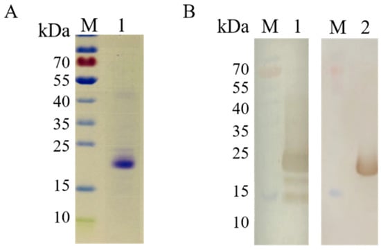 Identification of rCOE protein by SDS-PAGE and Western blotting. (A) Lane M, Prestained protein marker. Lane 1, purified rCOE protein. (B) Lane 1, Immunoblotting with anti-His mouse monoclonal antibody. Lane 2, Immunoblotting with anti-PEDV positive serum. A prominent band with the expected size of 22 kDa appeared after incubation.