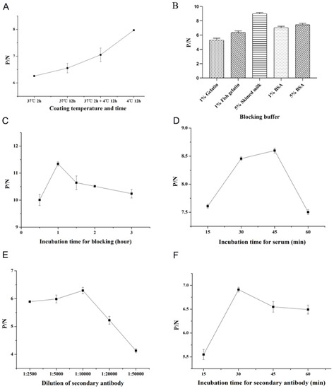 Based on the method described above, the optimal coating antigen concentration and standard serum dilution multiple for the COE-iELISA were determined by checkerboard titration. The additional conditions, including coating time and temperature, blocking buffer, dilution multiple of secondary antibody, and the incubation times for blocking, serum reaction, and secondary antibody, were further optimized. The factors that showed the highest ratio of positive and negative serum A450nm (PA450nm/NA450nm, P/N) values were scored as optimal reaction conditions [24].