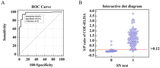 Receiver operating characteristic (ROC) curve analysis. (A) ROC curve of COE-iELISA with the cumulative data of the SN test as standard. (B) Interactive dot diagram of COE-iELISA and SN test (0 = negative samples, 1 = positive samples).