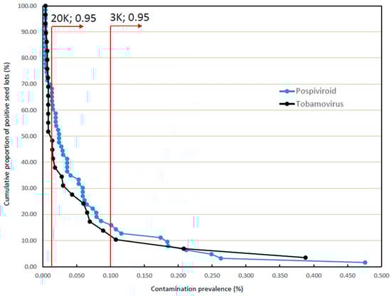 The comparison shows that the two cumulative distribution curves possess similar forms, indicating the presence, in both Tobamovirus- and Pospiviroid-contaminated seed lots, of a relatively small number of heavily contaminated lots and a larger number of more sparsely contaminated lots. On a quantitative basis, the levels of contamination were also broadly comparable for the two pathogen groups, ranging from 0.388% to 0.004% for tobamoviruses (the latter being the lowest possible estimation for the analytical procedure used), and from 0.476% to 0.004% for pospiviroids. The median contamination prevalences were 0.014% and 0.024% for tobamoviruses and pospiviroids, respectively, (the former with inclusion of the two non-estimable contaminated samples noted above and recognising that population sizes differ between the two groups).