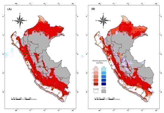 Additionally, future model transfers showed more stable suitable areas for C. insignis (i.e., suitable in current and future climate scenarios) than BTV across the Peruvian east (Figure 3 and Figure 4). The areas of range reduction (loss) were higher in BTV and mainly on the coast and the eastern zone (Figure 3A,B), whereas there was no evidence of a reduction in SSP126 for C. insignis (Figure 4A), but SSP585 showed few reductions in the center of Peru (Figure 4B). A range expansion (gain) was evidenced for C. insignis with high agreement for the five GCMs; however, BTV distribution showed that the gain of suitable areas was concentrated in the northern parts of Peru (Figure 3A,B). In general, we noted greater agreement among the five GCMs in terms of losses for BTV and gains for C. insignis in both SSP126 and SSP585 scenarios.