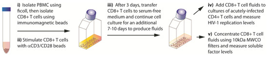 HIV-inhibition assays. The effects of CD8+ T cells directly, and of CD8+ T cell culture supernatants, on HIV-1-replication levels in heterologous primary human CD4+ T cells were measured as previously described [20,33,34]. Briefly, freshly isolated CD4+ T cells were stimulated with PHA for 3 days, acutely infected with a primary β-chemokine-insensitive HIV-1 isolate (X4 tropic; 10,000 TCID50) [35], and then cultured in the presence (experimental condition) or absence (control condition) of CD8+ T cells (1:1 input ratio) or CD8+ T cell fluids (50% v/v). On day 3 of the HIV-inhibition assay, 50% of the cell culture medium was collected and replaced with fresh medium or CD8+ T cell fluid. On day 6 of the HIV-inhibition assay, the cell culture supernatants were collected, centrifuged (1000× g for 15 min) to remove cellular debris, and HIV-1 p24 levels were measured by ELISA (NIH AIDS Reagents Program). Anti-HIV activity was calculated as:
