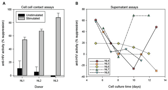 Importantly, the present studies demonstrate that CD8+ T cell culture supernatants from healthy blood bank donors can also suppress HIV-1 replication (Figure 2b). While most of the individual CD8+ T cell cultures yielded at least one supernatant having >50% anti-HIV-1 activity, the timing of those cell culture supernatants was variable. This observation is perhaps due to donor-donor variation in the frequency of memory CD8+ T cells and/or variation in the growth rates of the cells. In comparison to prior results [20,44], the CD8+ T cell culture supernatants derived from healthy blood donors and asymptomatic HIV-1-infected individuals exhibit roughly equivalent levels of anti-HIV activity (generally < 75% suppression).