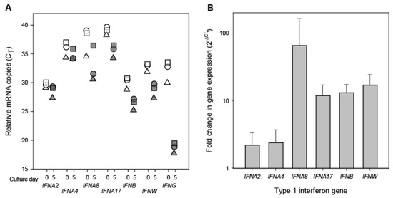 - Brandt, E.R.; Linnane, A.W.; Devenish, R.J. Expression of IFN A genes in subpopulations of peripheral blood cells. Br. J. Haematol. 1994, 86, 717–725. [Google Scholar] [CrossRef]