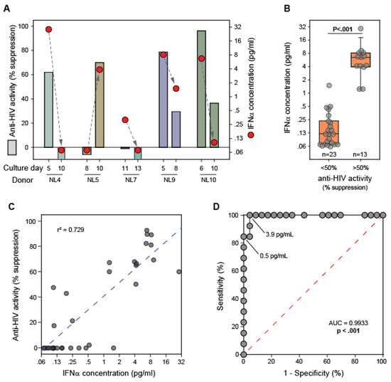 In addition, we performed a receiver operating characteristic (ROC) analysis to assess the ability of the ELISA-measured IFNα concentration to classify the anti-HIV-1 activity (<50% or >50%) of the CD8+ T cell culture supernatant (Figure 4D). The resulting area under the ROC curve was strikingly high (AUC = 0.993, p < 0.001). IFNα concentrations of 0.5 pg/mL and 3.9 pg/mL bridged the boundaries between 100% specificity and 100% sensitivity values respectively. The ROC analysis indicated that an IFNα concentration threshold of 0.8 pg/mL can predict the anti-HIV-1 activity status with 96% specificity and 100% sensitivity. In previous studies we have shown that approximately 1 pg/mL of IFNα can cause a 50% reduction in HIV-1 replication in our assay [20]. Therefore, these results demonstrate that CD8+ T cells from healthy blood donors secrete IFNα at levels that can suppress HIV-1 replication in vitro.