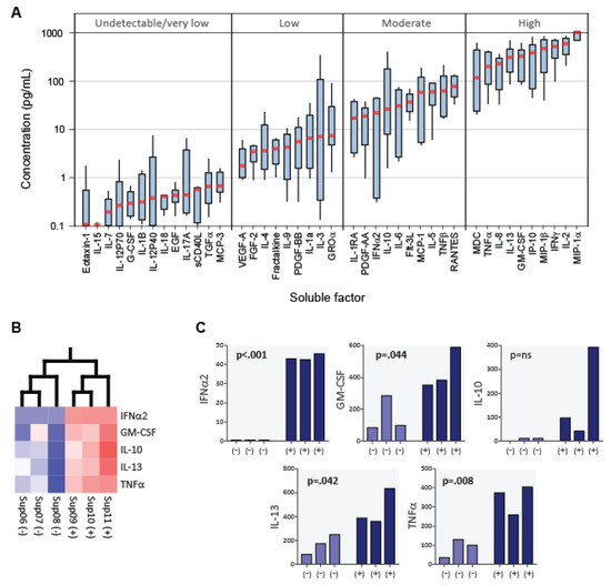 Here, we have also provided an assessment of the concentrations of 42 soluble factors that can be present in CD8+ T cell culture supernatants (Figure 5). In addition to IFNα, we found GM-CSF, IL-10, IL-13, and TNFα to be present at elevated levels in CD8+ T cell culture fludis having anti-HIV-1 activity. GM-CSF is known to be produced by activated T cells [50], but it does not inhibit HIV-1 replication in CD4+ T cells [51] and its receptor (GMCSFR/CD116) is not expressed on normal T cells [52]. IL-10 does not inhibit HIV-1 replication in T cells and does not act to inhibit HIV-1 replication at the transcriptional level [53]. Moreover, IL-13 [54] and TNFα [55] do inhibit HIV-1 replication in T cells.