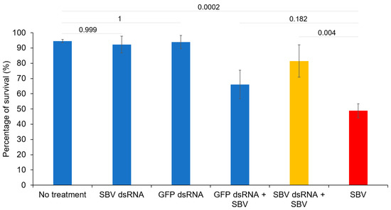 APA StyleYoo, M.-S., Truong, A.-T., Jeong, H., Hahn, D.-H., Lee, J.-S., Yoon, S.-S., Youn, S.-Y., & Cho, Y.-S. (2023). Large-Scale Application of Double-Stranded RNA Shows Potential for Reduction of Sacbrood Virus Disease in Apis cerana Apiaries. Viruses, 15(4), 897. https://doi.org/10.3390/v15040897