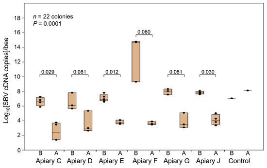- Anderson, D.L.; Gibbs, A.J. Transpuparial Transmission of Kashmir Bee Virus and Sacbrood Virus in the Honey Bee (Apis mellifera). Ann. Appl. Biol. 1989, 114, 1–7. [Google Scholar] [CrossRef]