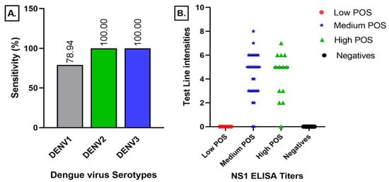 Of the 48 Platelia Dengue NS1 (Biorad Laboratories, Marnes-la-coquette, France) positive samples, 42 were scored positive by the Dengue NS1 RDT, yielding a sensitivity of 88% [75–95%]. All 128 negative samples (Table 1) were scored as negative, yielding a specificity of 100% [97–100%] across all agents tested. The serotype sensitivity of the Dengue NS1 RDT for DENV-1 was found to be the lowest at 79% [63–90%] while it was 100% [59–100%] for DENV-2 and DENV-3 [29–100%] (see Figure 3), however, they had lower sample populations (Table 1). Specificity was determined at 100% [97–100%] for all of the conditions tested. Table S1 in Supplementary Materials provides exhaustive detailed results.
