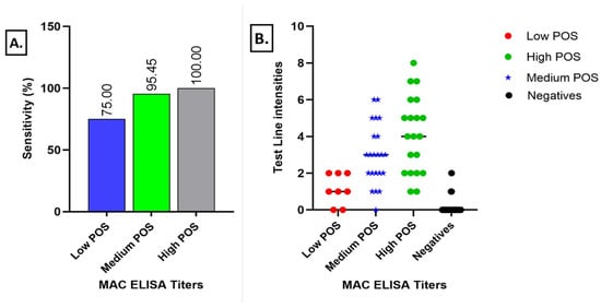 Sensitivity of the IgG/IgM RDT versus ELISA IgM ratio (A) and MAC ELISA titres (B).
