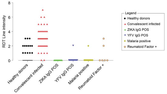 A sensitivity of 70% [59–79%] was found with the sensitivity panel samples. A specificity of 91% [79–98%] was found with cross reacting flaviviruses (ZIKV, YFV) and interfering conditions (malaria, rheumatoid factor). See Table S3 in the Supplementary Materials for exhaustive detailed results. Figure 5 shows the distribution of the test line intensities depending on the sample characterisation.