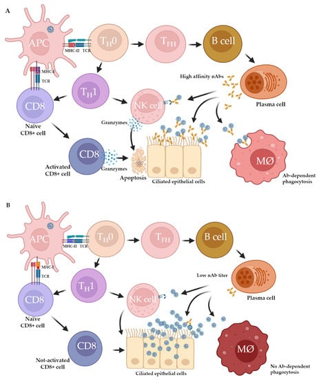 SARS-CoV-2 enters the respiratory tract’s airway epithelial cells via the angiotensin-converting enzyme 2 (ACE2)—the host receptor for the receptor-binding domain (RBD) of the spike protein of SARS-CoV-2 []. The cell surface-associated transmembrane serine protease (TMPRSS2) regulates the binding of the RBD to the ACE2 receptor that eventually triggers endocytosis of the virus, followed by the release of the viral mRNA into the host cells’ cytoplasm []. Within the cytoplasm, the virus hijacks the host cell machinery to initiate the replication and release of new viral particles. The release of damage-associated molecular patterns (DAMP) along with microorganism-associated molecular patterns (MAMPs) is followed by the host’s pattern-recognition receptors (PRRs) recognizing the neighboring airway cells, and the recruitment of a multitude of immune cells, including APCs, which present SARS-CoV-2 antigens during the generation of adaptive immune responses. Hence, the initial immune response characterized by the activation of innate immunity is followed by a virus-specific adaptive immune response.