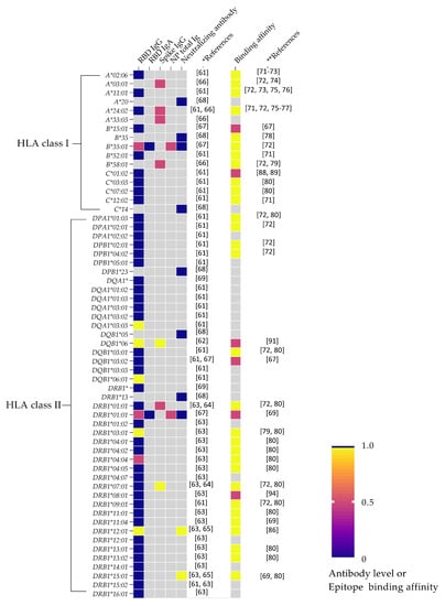 Heat-map showing the association between HLA variants and antibody responses or epitope binding affinity. Associations are depicted arbitrarily as high (scaled 1, yellow boxes), low (scaled 0.5, red boxes), or no association (scaled 0, dark-blue boxes). Gray boxes indicate undetermined values. References shown are for antibody response* or epitope binding affinity** studies.