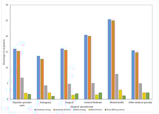 Hepatitis specialist units had the highest number of episodes with hepatitis C separation coding with 1159 episodes for 576 patients. Patients with episodes in mental health had the highest rates of antibody testing (70/276, 25.4%), while patients with episodes in emergency had the lowest (101/738, 13.7%). Patients with episodes in hepatitis specialist units had the highest rates of RNA testing (39/88, 44.3%), while patients with episodes in general medicine had the lowest (15/59, 25.4%). The cascade of care per specialty is shown in Figure 2 and Table 2.