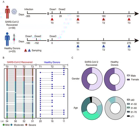 Individuals with previous SARS-CoV-2 infection and healthy donor cohorts and study design. (A) Study design of the vaccine cohort. Red and blue triangles indicate sampling collections, the numbers above the triangles indicate the days after the vaccination, and the timepoint for sampling is below the triangles. (B) Participants received the SARS-CoV-2 inactivated vaccine and donated blood at four visits. Disease severity status in individuals with previous SARS-CoV-2 infection is color-coded: mild (light green), moderate (dark green), or severe (red). Healthy donors are shown in blue. The bottom row displays the number of samples collected for each timepoint. (C) The pie plots show the distribution of sex and age in the two cohorts.