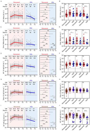 Dynamic changes of virus-specific antibodies in individuals with previous SARS-CoV-2 infection and healthy donors. The left parts show dynamic changes in NAbs against wild-type strain (A), NAbs against Omicron (C), Spike S1 domain-specific antibodies against wild-type strain (E), Spike S1 domain-specific antibodies against Omicron (G), and nucleoside protein-specific IgG antibodies against wild-type strain (I) in two cohorts over the different timepoints. Individuals are shown as gray symbols with connecting lines for longitudinal samples. Geometric means are shown in thick, colored lines: individuals with previous SARS-CoV-2 infection are color-coded in red and healthy donors in blue. The right parts show the comparison of antibodies between different time points. The scatter diagrams show the comparison of NAbs against wild-type strain (B), NAbs against Omicron (D), Spike S1 domain-specific antibodies against wild-type strain (F), Spike S1 domain-specific antibodies against Omicron (H), and nucleoside protein-specific IgG antibodies against wild-type strain (J) between individuals with previous SARS-CoV-2 infection and healthy donors at 3, 6, and 9 months post-vaccination. Dotted lines indicate the cut-off value. Statistics were calculated using Wilcoxon’s signed-rank test for paired groups and Mann–Whitney U test for unpaired groups: * p < 0.05; ** p < 0.01; *** p < 0.001; **** p < 0.0001. GM, geometric mean; Res, responders; NAbs, neutralizing antibodies; WT, wild-type strain; Omic, Omicron.
