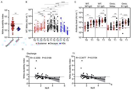Association of clinical factors with wild-type neutralizing antibody duration after vaccination. (A) Dot plot shows the ranges of NAbs durability index for individuals with previous SARS-CoV-2 infection (red, n = 49) and healthy donors (blue, n = 7). (B) Wild-type NAb levels in the Sustainer group (red, n = 16), Decayer group (black, n = 33), and healthy donors (blue, n = 7) after vaccination. (C) Dot plot showing the antibody levels in the Sustainer group (red, n = 16) and Decayer group (black, n = 33) at 12 months after infection (T0) and 3 months post-vaccination (T1). (D) Spearman rank correlation was used to analyze the NAbs durability index and the neutrophil-to-lymphocyte ratio at discharge (left) and 3 months after vaccination (T1) (right). The linear fitting was performed, and gray indicates 95% confidence intervals. Statistics were calculated using Wilcoxon’s signed-rank test for paired groups and Mann–Whitney U test for unpaired groups: * p < 0.05; ** p < 0.01; *** p < 0.001; **** p < 0.0001. NAbs, neutralizing antibodies; WT, wild-type strain; Omic, Omicron; NLR, neutrophil-to-lymphocyte ratio.