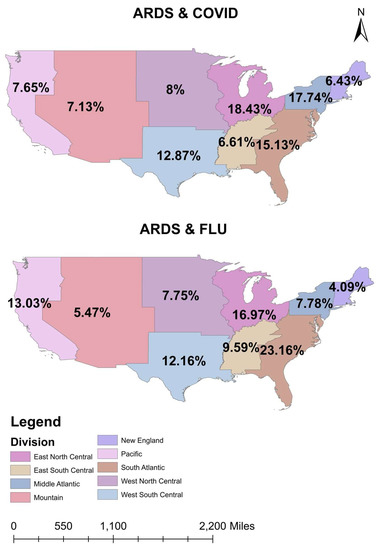 Geographic distribution of ARDS patients with COVID-19 and Influenza in the United States.