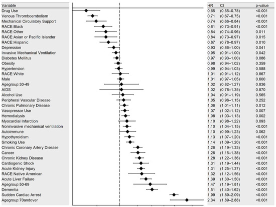 Multivariate analysis for predictors of mortality in C-ARDS showed that older patients had higher mortality rates, with HR 1.5 (CI 1.2–1.8, p < 0.001) in the 50–69 age group and HR 2.3 (CI 1.9–2.9, p < 0.001) in the 70 and above age group. Higher mortality rates were also observed in patients with comorbidities, including chronic pulmonary disease (HR 1.06 [CI 1.02–1.12], p = 0.12), hypothyroidism (HR 1.1 [CI 1.1–1.2], p < 0.001), smoking (HR 1.1 [1.1–1.2], p < 0.001), coronary artery disease (HR 1.3 [1.2–1.3], p < 0.001), malignancy (HR 1.3 [CI 1.2–1.4], p < 0.001), CKD (HR 1.3 [CI 1.2–1.4], p < 0.001), and dementia (HR 1.5 [CI 1.4–1.6], p < 0.001). Native Americans had significantly higher mortality rates than any other race, with HR 1.3 [CI 1.2–1.4], p < 0.001 (Figure 4).