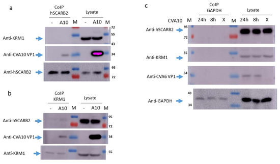 Additionally, GAPDH was observed in all the GAPDH-pulled-down precipitates and lysates (lower panel of Figure 2c). These results indicate that CVA10 VP1 can bind to both hSCARB2 and KRM1 during infection. Interestingly, KRM1 can physically associate with hSCARB2 in the presence of CVA10 infection in RD cells.