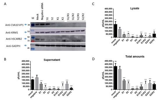 In parallel, the levels of de novo synthesized CVA10 in the supernatants and the cellular lysates of infected cells were also examined. The results revealed that the levels of de novo synthesized CVA10 in the supernatants and cellular lysates were significantly reduced upon transfection with S1 and S2 siRNA, compared to the levels of CVA10 obtained from the supernatants and the cellular lysates of the cells treated with negative siRNA (Figure 3B,C, respectively). The total levels of de novo synthesized CVA10 calculated by summing the levels obtained from the supernatants and cellular fractions showed that CVA10 production was inhibited by S1 and S2 siRNA treatment (Figure 3D). Similarly, the levels of de novo synthesized CVA10 in the supernatants and the cellular fractions were significantly reduced (Figure 3B,C, respectively), and the inhibition of total CVA10 levels by individual K1 and K2 siRNA was observed (Figure 3D).