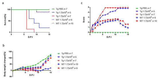 Pathogenesis and lethality of hSCARB2-Tg mice infected with CVA10. Scoring of (a) disease score, (b) loss of body weight, and (c) survival rate in 12-day-old hSCARB2-Tg and WT mice injected s.c. with 1.72 × 106 and 1.72 × 107 pfu of CVA10, individually, were monitored daily (day post-infection, D.P.I.) for 15 days and assessed following the criteria described in the Materials and Methods section. The same age of Tg mice injected s.c. with PBS as control was included. The number (n) of mice per group was shown.