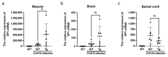 Viral distribution in the tissues and organs of CVA10-infected mice. Twelve-day-old WT and hSCARB2-Tg mice were injected with 1.72 × 107 pfu of CVA10 s.c. On day 3, post-viral infection, RNA extracted from the (a) muscle, (b) brain, and (c) spinal cord of the mice were subjected to quantitative RT-PCR analysis using primers specific to the VP1 region. β-actin gene expression in each tissue was used as the internal control. A schematic representation of the VP1 gene expression and the statistical average from six mice per group, as described in the Materials and Methods section, is shown. The symbols * and ns were used to indicate p < 0.05 and no significant difference, respectively.