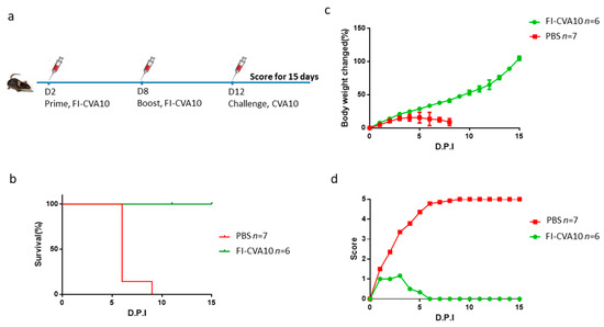Protection of hSCARB2-Tg mice from CVA10 challenge by FI-CVA10 vaccine. (a) The flowchart of vaccine immunization following the challenge of CVA10 in Tg mice was shown. One-day-old Tg mice were s.c. immunized with two doses of FI-CVA10 vaccine or PBS on day 2 and day 8, following s.c. injection of 1.72 × 107 pfu of CVA10 on day 11 was performed. Daily recording of (b) percentage of mice survival, (c) loss of body weight, and (d) disease score for 15 days of hSCARB2-Tg mice receiving PBS or FI-CVA10 was performed. Data represent the mean scores obtained from the individual number of (n) mice per group.