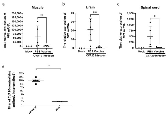 Reduction in viruses in the tissues of CVA10-infected mice pre-receiving FI-CVA10 vaccine. On day 3 post-viral infection, RNA was extracted from the (a) muscle, (b) brain, and (c) spinal cord of Tg mice, which had been pre-immunized with PBS or two-dose of FI-CVA10 (described in the legend of Figure 6), and were subjected to quantitative RT-PCR analysis using primers specific to the VP1 region. RNA from the same age of Tg mice without any treatment (Mock) as background control was included. β-actin gene expression in each tissue was used as the internal control to calculate the relative expression of VP1 mRNA. A schematic representation of the VP1 gene expression and the statistical average from five mice per group from the FI-CVA10-treated group and three mice per group from the PBS-treated group (minimizing the number of animals used in the test) is shown. (d) Tg mice (6–8 weeks old) pre-immunized with PBS or two-dose of FI-CVA10 at a 2-week interval. Serum samples collected from individual Tg mice on day 28 post the second shot of FI-CVA10 were assayed for the titer of anti-CVA10 neutralizing antibodies. The results were expressed as titers for each test sample. Bars correspond to the mean titers for each experimental group. The symbols *, **, and ns were used to indicate p < 0.05, p < 0.01, and no significant difference, respectively.