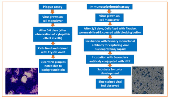 For the first time, Okuno’s group has described peroxidase-anti-peroxidase (PAP) staining-based NTs, and afterwards, immunostaining-based methods on various cell substrates have been standardized for other viruses of public health importance [14,15,16,17,18]. A human epithelial cell (Hep-2C)-based sensitive, specific, and rapid method was described for detection and identification of polioviruses in a large number of clinical specimens [19]. The majority of immunostaining-based methods [Table 1] require a specific cell fixative (formaldehyde, paraformaldehyde, glutaraldehyde, methanol, methanol-acetone, ethanol, acetone, etc.), a cell permeabilization reagent (Triton-X 100, NP-40 solution, Ethanol, Methanol, etc.), a blocking buffer (containing bovine serum albumin, skimmed milk powder, fetal bovine serum, Tween-80, etc.), a primary antibody (monoclonal or polyclonal), an alkaline phosphatase or peroxidase-conjugated secondary antibody, and a particular substrate (3,3′, 5,5′-Tetramethylbenzidine, Nitro blue Tetrazolium plus X Gal, 3,3′-Diaminobenzedene tetrachloride, 3-amino 9-ethylcarbazole, etc.) for the immuno-precipitation of viral foci. All of the published immuno-staining-based assays described in Table 1 were based on various cell substrates (i.e., epithelial, endothelial, fibroblast, and neuroblastoma), These assays also required various incubation periods for virus-serum interactions, primary or secondary antibody binding, and the assay completion time may vary between 12 h to 13 days after infection, depending on the appearance of visible and countable virus foci. Afterwards, for the detection of viruses directly from the clinical samples or cell culture fluids (virus isolates), many investigators utilized immunocolorimetric assay (ICA)-based methods. Detection of virus-infected cells and their quantifications were documented for the wild-type polioviruses and rubella viruses using cell passaged soup and clinical specimens [19,20]. These studies describe the utility of ICAs for their respective surveillance programs and pre- and post-vaccination studies. Subsequently, ICA has been employed for the detection of measles, mumps, and rubella viruses in the clinical specimens collected from suspected cases and cell culture-grown viral isolates [21,22].