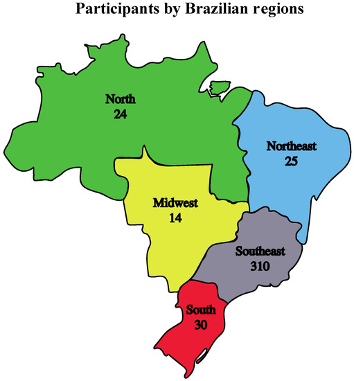Distribution of the 418 Brazilian attendees at the 33rd SBV Annual Meeting by Brazilian geographic areas. Each Brazilian region is represented by a different color, and the number of attendees per region is shown. Nineteen attendees were foreign and were not represented on the map.