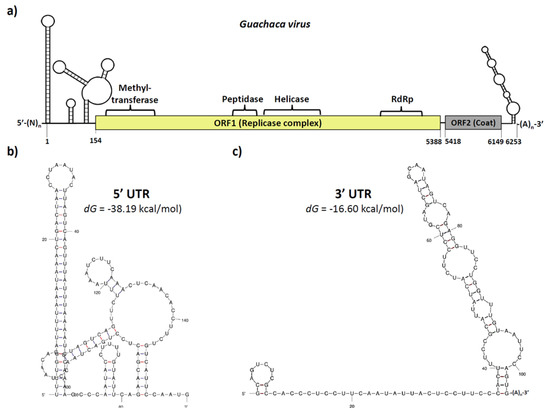 Genomic organization of the putative Guachaca virus (GUAV). (a) The GUAV genome was approximately 6250 nucleotides in length and comprised a 5′ UTR, a large ORF (ORF1) encoding for the replicase complex, a short ORF (ORF2) encoding for the structural coat protein, a 3′ UTR, and a poly(A) tail. (b) The 5′ UTR of around 153 nucleotides in length contains a highly stable IRES-like structure. (c) The 3′ UTR of around 125 nt in length contains a long partially mismatched stem-loop structure, followed by a poly(A) tail.