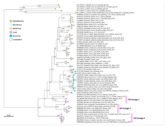 A nucleotide sequence dataset was generated through the identification of the ORF1 in previously released sequences of members of the family Tymoviridae, followed by a multiple sequence alignment (MSA) at the nucleotide and amino acid levels using MAFFT v.7 [23]. Accounting for the high genetic distance between some species of the family, a well-represented and unambiguous region of 3480 nt was selected for phylogenetic analysis. The nucleotide substitution model was estimated for the dataset through ModelFinder [24] and the maximum likelihood method was used for tree reconstruction with IQ-TREE [25]. Branch support was estimated by UltraFast Bootstrap with 1000 replicates [26].
