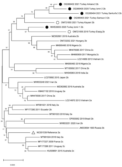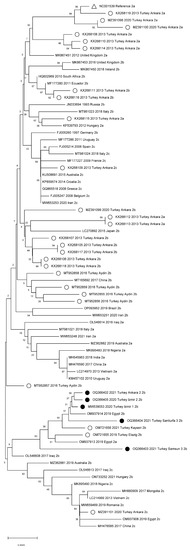 For the whole-genome phylogenetic analysis, nearby countries were selected first, followed by more distant countries as the basis. Two genomes that had been previously reported in Turkey were also added [12]; 43 sequences were taken from GenBank data (Supplement S2) and previous studies [26,27,28,29,30,31,32,33,34,35,36,37,38,39,40,41,42].