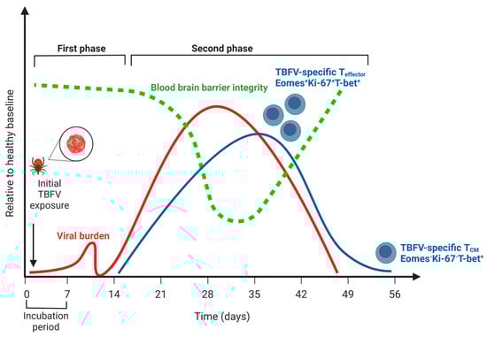 The course of human disease during tick-borne flavivirus (TBFV) encephalitis relative to a healthy baseline. Viral burden is indicated by the red line; note that no distinction is made between peripheral viremia (i.e., during the first phase of disease) and viral replication in the central nervous system (i.e., during the second phase of disease). Blood-brain barrier integrity is indicated by the green line, and notably does not decline until after viremia in the CNS has begun. The T cell response is indicated by the blue line, and the distinction between effector T cells (Eomes+Ki-67+T-bet+) and central memory (Eomes-Ki-67-T-bet+) is highlighted (see Blom, 2018, 30319632). Note that a low frequency of memory cells persists following CNS viral replication and symptoms. Created with BioRender.com (accessed on 31 January 2023).