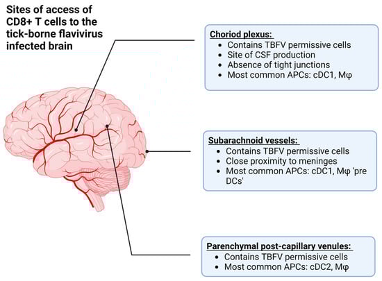 The approximate anatomical locations where T cells can access the central nervous system (CNS) in order to combat tick-borne flavivirus (TBFV) infection. Additionally, this figure describes the antigen presenting cells (APCs) located at each site, such as conventional dendritic cells (type 1 or 2, cDC1 or cDC2), or macrophages (Mφ). Among these are the choroid plexus, which is the site of cerebrospinal fluid (CSF) production, the subarachnoid vessels, and parenchymal post-capillary venules. Created with BioRender.com, accessed on 31 January 2023.