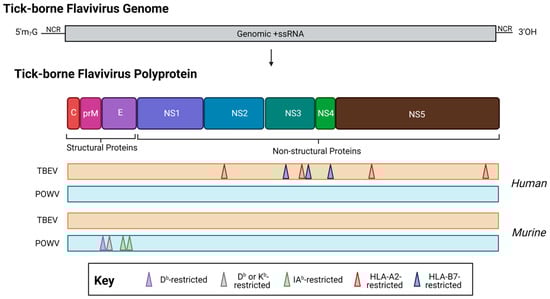 The location of T cell epitopes identified for tick-borne encephalitis virus (orange, TBEV, European subtype, Neudörfl strain) and Powassan virus (teal, POWV, lineage I, POWV-LB) in human (top) or murine (bottom) infection. When possible, MHC restriction is indicated. Note: drawing is not to scale, and regions are approximate. For a detailed location of epitopes relative to the polyprotein, see Table 1. Created with BioRender.com, accessed on 31 January 2023.