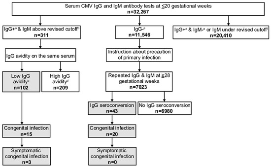 - Shimada, K.; Toriyabe, K.; Kitamura, A.; Morikawa, F.; Ikejiri, M.; Minematsu, T.; Nakamura, H.; Suga, S.; Ikeda, T. Characteristics and serology of pregnant women with cytomegalovirus immunoglobulin G seroconversion during pregnancy in Japan. Taiwan J. Obstet. Gynecol. 2021, 60, 621–627. [Google Scholar] [CrossRef]