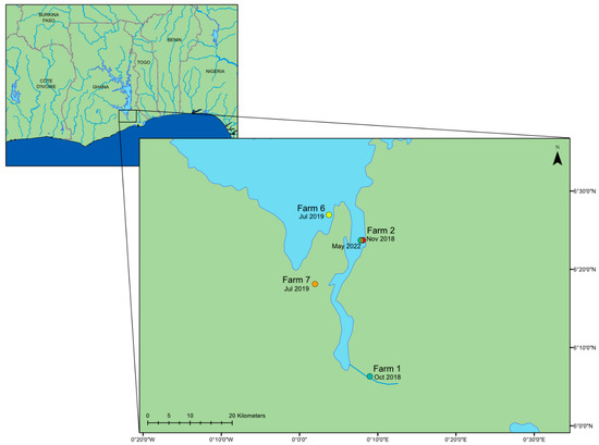 - Sasu, D.D. Ghana: Annual Volume of Tilapia Production. Statista. 2021. Available online: https://www.statista.com/statistics/1278956/production-volume-of-tilapia-in-ghana/ (accessed on 3 March 2023).
