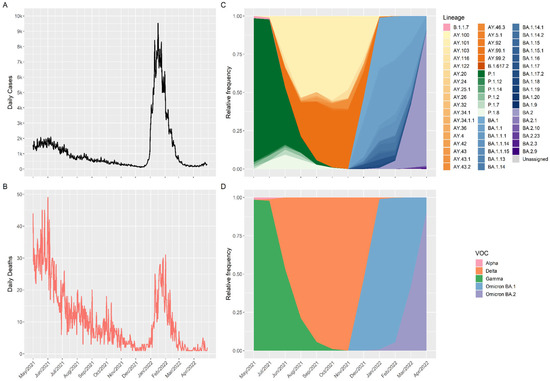 Number of cases/deaths and variant distribution of SARS-CoV-2 from 1 May 2021 to 30 April 2022. (A) Daily cases and (B) daily deaths, according to the Boa Vista platform (https://dados.sc.gov.br, accessed on 15 December 2022). SARS-CoV-2 variant profile (C) by lineage and (D) by variant of concern (VOC).