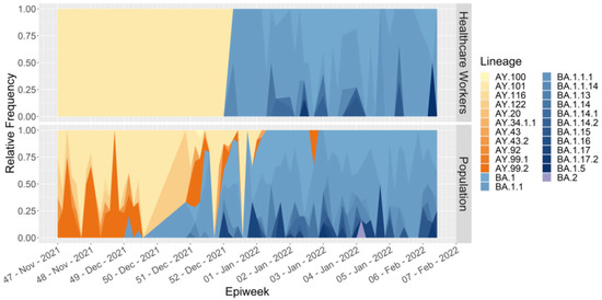 Comparison of relative frequency for each SARS-CoV-2 lineage in healthcare workers and general population during the variant shift from Delta to Omicron.
