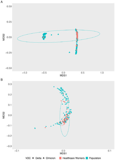 Multidimensional scale (MDS) with Jaccard dissimilarity plot of genomes based on amino acids and presence/absence of mutations, deletions, and insertions—a comparison between healthcare workers and the general population of Santa Catarina, from November 2021 to February 2022. (A) Displaying Delta and Omicron variants (B) Omicron BA.1 lineage and sublineages.