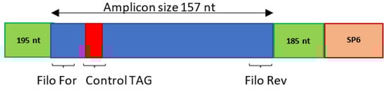 Graphic representation of the synthetic constructs designed for use as assay controls. Each construct consists of a 537-nucleotide partial nucleoprotein sequence of the selected viral species (Table 1). The expected amplicon size for the filovirus products was 157 bp. The control tag sequence was situated at position 34–51 within the assay amplification region. The SP6 promotor was located at the end of the synthetic construct to allow for the synthesis of RNA transcripts.