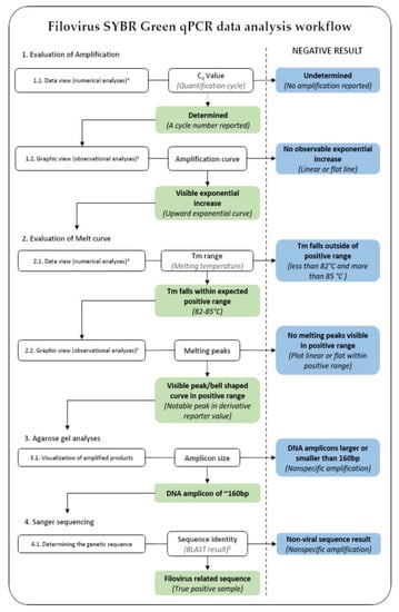 Filovirus SYBR Green qPCR data analysis workflow. The diagram depicts the workflow to assess individual samples at several steps to determine the additional analyses required for suspected positive samples. Results indicated in light blue represent negative samples and no further analyses were needed. Findings indicated in light green require further data analyses indicated with arrows. *: Numerical values of the Cq/Tm provided; #: Visual representation of the amplification/melt curve plots; $: Analyses of nucleotide sequences using the BLAST function of the National Center for Biotechnology Information (NCBI) database (accessible online at https://blast.ncbi.nlm.nih.gov/Blast.cgi (accessed on 10 January 2023)).