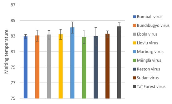 Average melting temperatures of the amplified filovirus standard templates (100–109 copies/reaction). Error bars indicate the standard deviation.