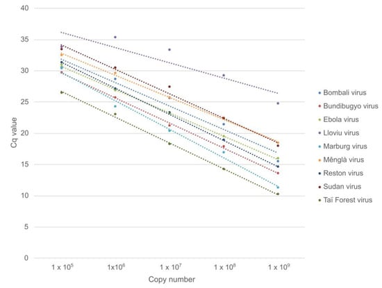All reactions were performed using the OneStep RT-PCR Kit (Qiagen, Hilden, Germany) and the QuantStudio 5 real-time PCR system (Applied Biosystems, Waltham, MA, USA). Separate reactions were performed for EBOV and MARV serially diluted cell culture virus and each dilution was tested once. Reactions were performed in a final volume of 25 µL containing 2.5 mM OneStep RT-PCR buffer, 0.4 mM dNTP mix, 0.6 µM forward primer (Table 2), 0.7 µM reverse primer (Table 2), 0.1 µM probe (Table 2), 32 µg/mL bovine serum albumin, 2 µL OneStep RT-PCR enzyme, and 5 µL RNA. Reactions were incubated at 50 °C for 30 min, 95 °C for 15 min, followed by 45 cycles of 95 °C for 15 s, 52 °C for 25 s (with acquisition of fluorescence), and 72 °C for 20 s.