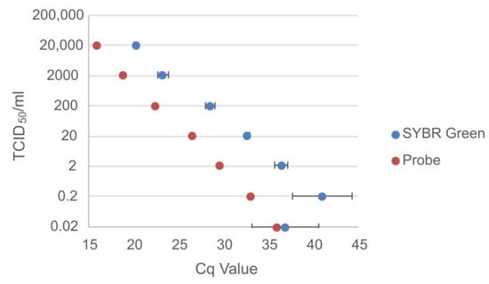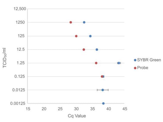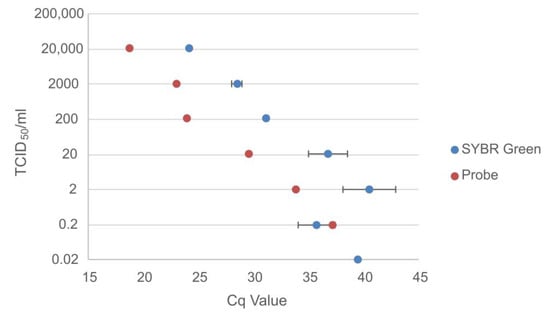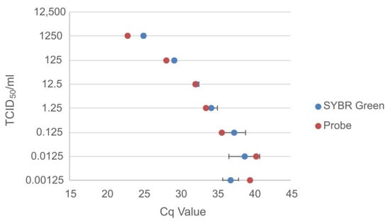 Comparison of the Cq values for the probe-based assay and the average Cq values for the SYBR Green assay for the titrated (TCID50/mL) serially diluted Ebola virus.