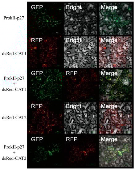 Furthermore, we investigate whether coexpression can change the subcellular distribution of p27 and SlCAT1 or SlCAT2. The results showed that p27 co-locates with SlCAT1 or SlCAT2 in aggregated particles in the cytoplasm (Figure 5). These results suggest that SlCAT1 or SlCAT2 could change the location of p27.